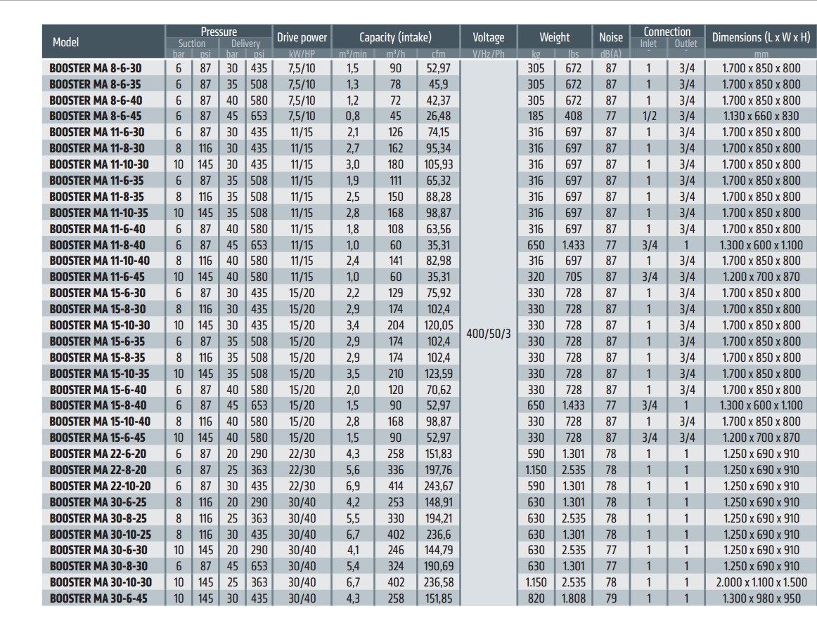 Thông số kỹ thuật máy nén khí Boosters tăng áp Mega Air