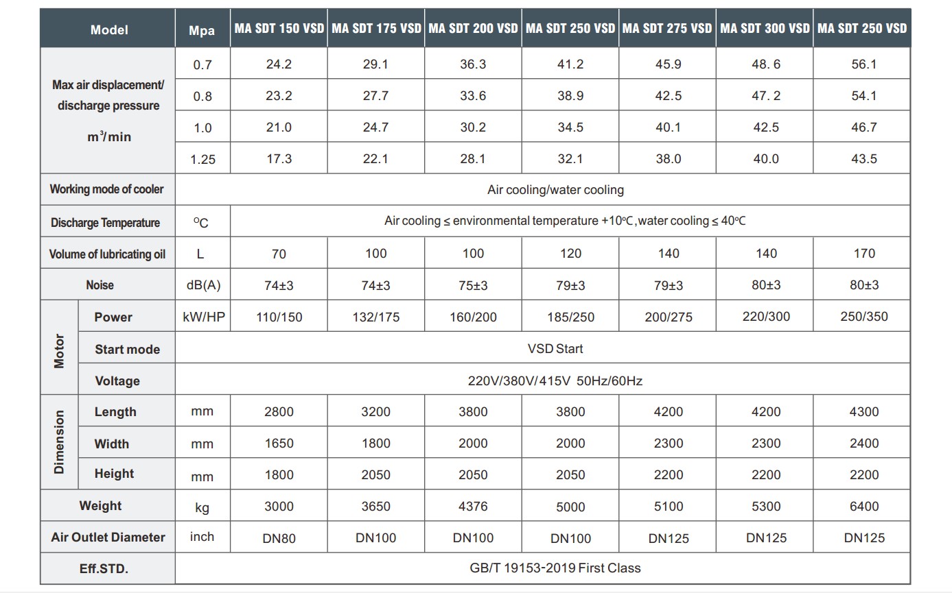 2. Thông số máy nén khí trục vít 2 cấp biến tần Mega Air MA STD